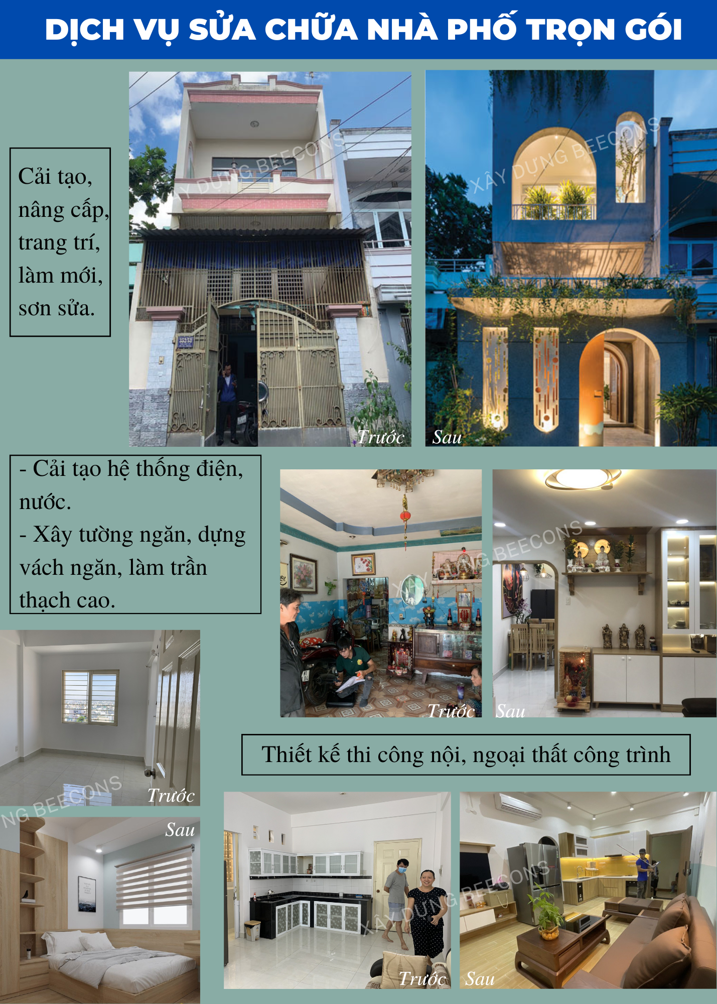 - Dịch vụ toàn diện: Từ khâu tư vấn, thiết kế, đến thi công và hoàn thiện, Beecons luôn đồng hành cùng khách hàng trong suốt quá trình cải tạo, đảm bảo sự hài lòng tối đa.